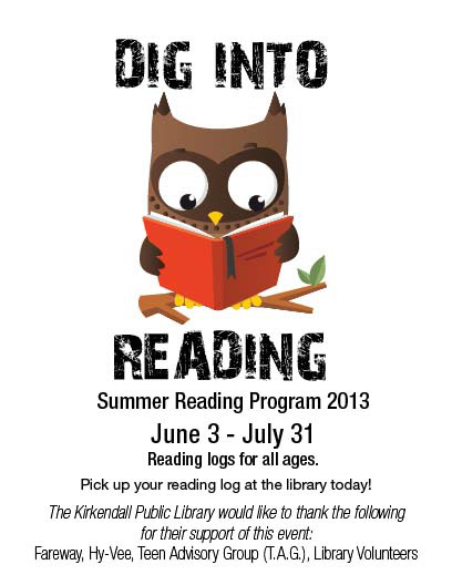 The Kirkendall Public Library hosts an annual Family Fun Walk as the kickoff to their summer reading program. In 2013, the theme was dinosaurs. Participants were asked to walk around a nearby lake, stopping at stations along the route to learn more about dinosaurs. Prizes were given to everyone who collected a stamp from each station and completed the walk.